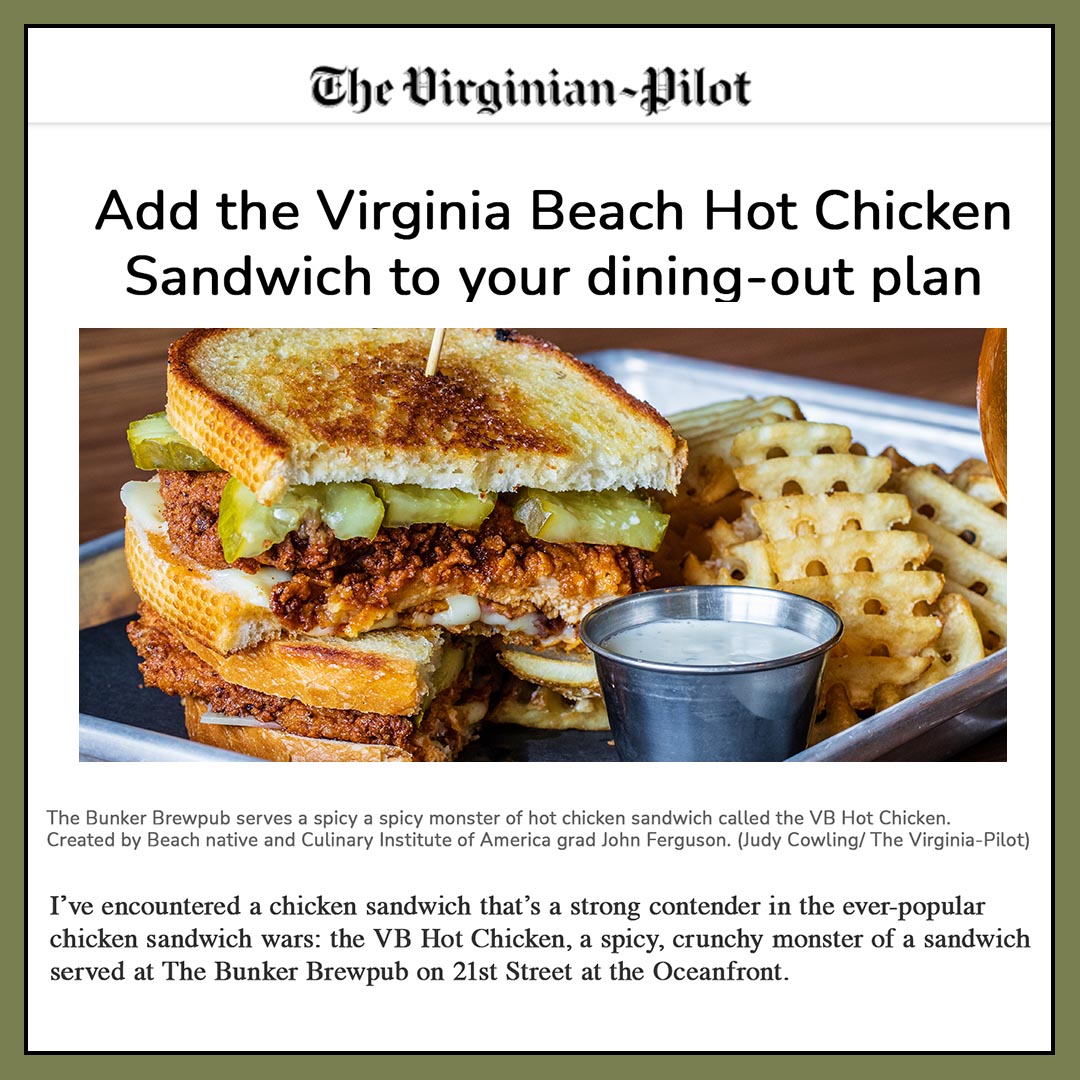 So began The Bunker! A family friendly restaurant specializing in the taste of southern coastal cuisine; complete with seafood pasta, burgers, crab cakes and our famous Virginia Beach Hot Chicken Sandwich! Of course, no brewpub would be