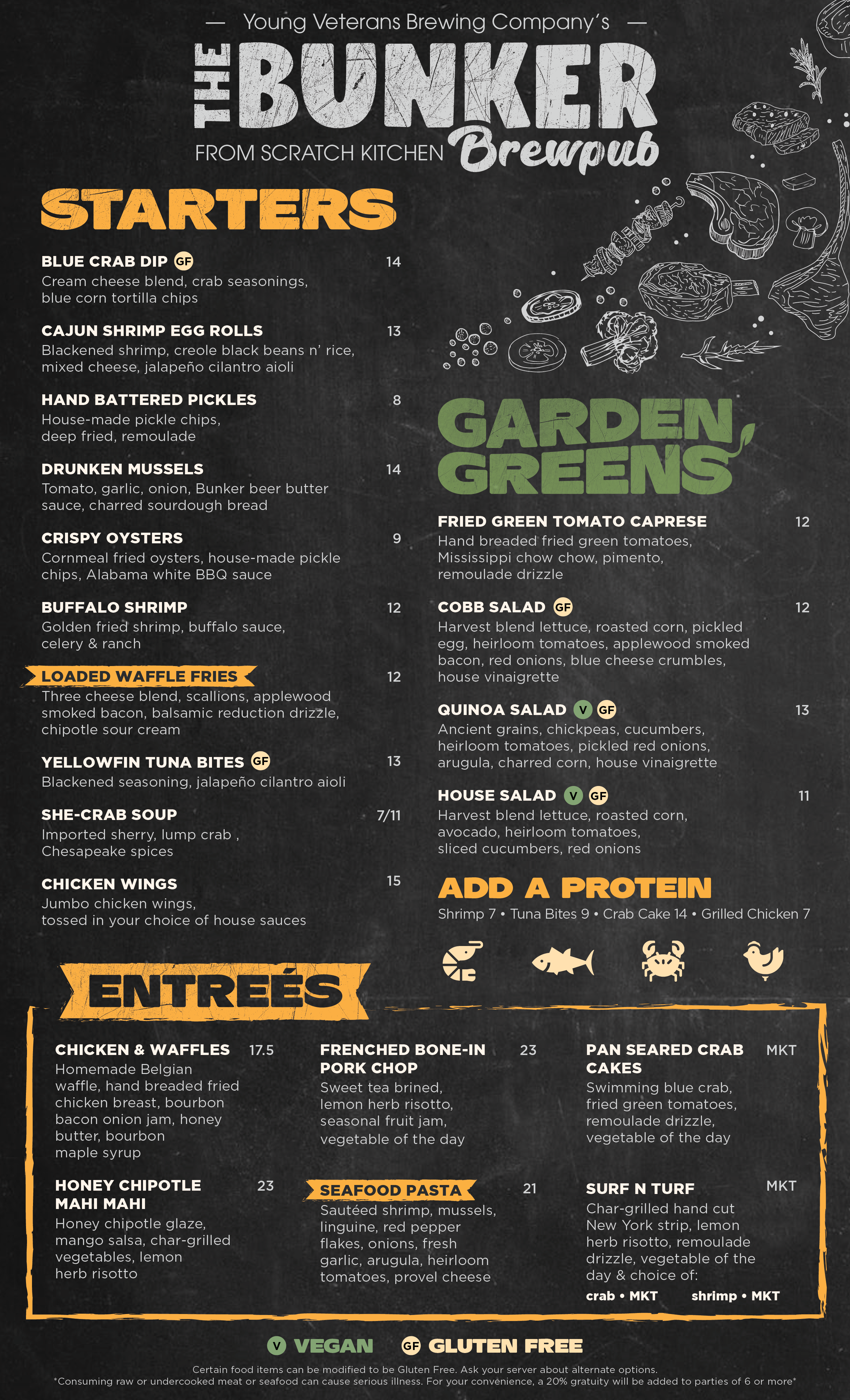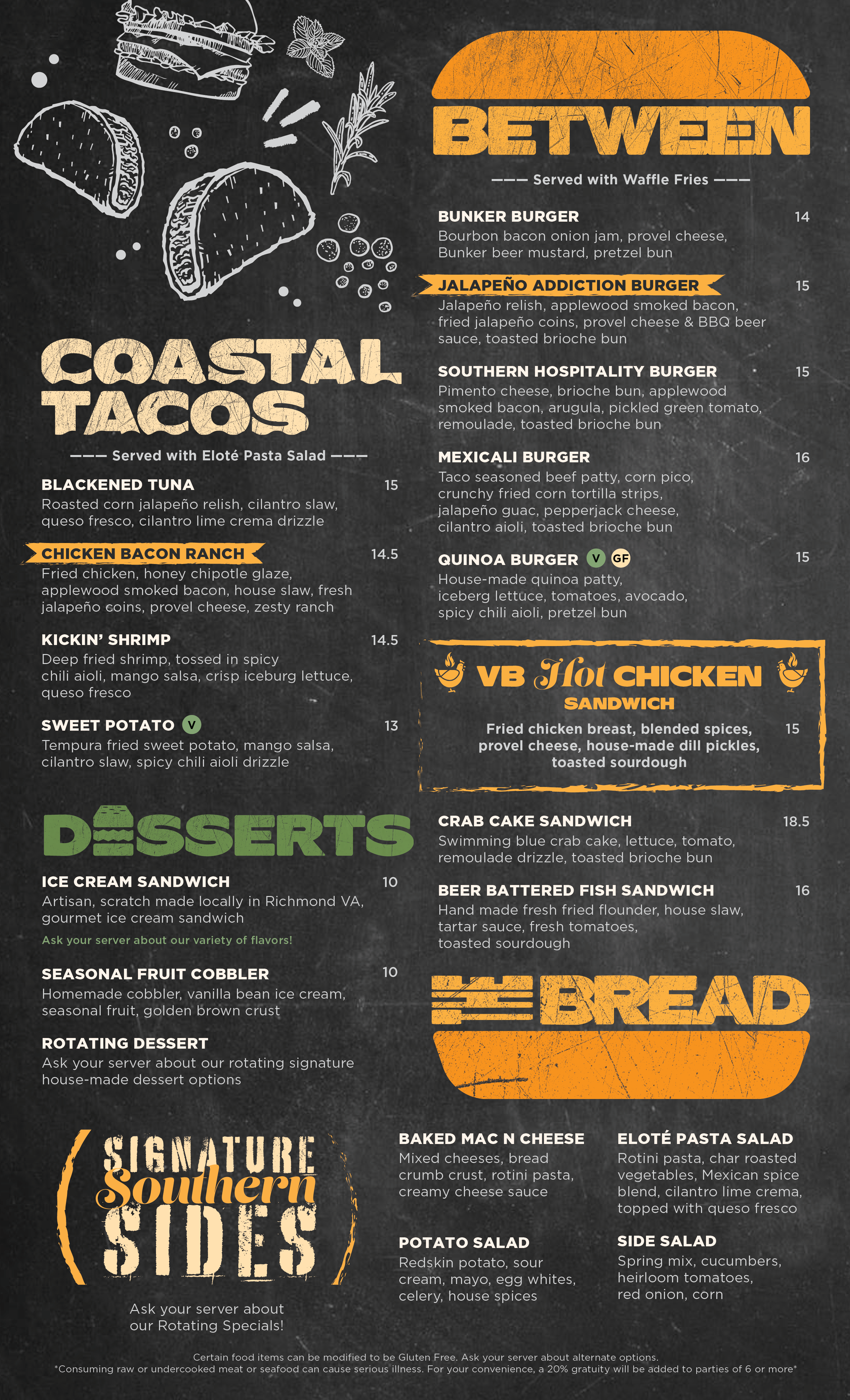We are a from-scratch kitchen featuring the taste of Southern Coastal cuisine. From our delicious Pan-Seared Crab Cakes to our praiseworthy Virginia Beach Hot Chicken Sandwich; there's something on our menu for everyone to enjoy, even for the kids.